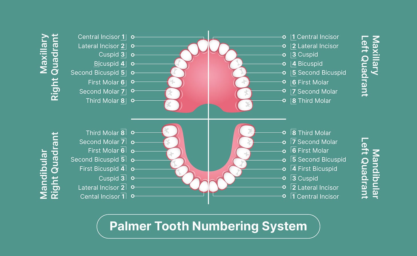 They split into four sets of eight. It’s even easy to see, according to this pattern, how from ancient times there is ambiguity naming and numbering the four Books of Kingdoms. Calling them 1–2 Samuel and 1–2 Kings, according to the Jerusalem tradition (it’s not a Masoretic innovation), is like thinking of the teeth as right and left maxillary (upper jaw) and right and left mandibular (lower jaw). Or like the Septuagint tradition, you could think of them as four quadrants of one unit. It’s the same with the lunar cycle. It’s either a four-week unit, or there’s a two-week waxing period paired with a two-week waning period. This is why the seven-day week is a natural unit, by the way, and not just an invention of the Torah; ancient Babylon observed it first. But sevenfold time calls for an eighth-day eternity, and we’re back to the octave structure. Now it’s time to look at the sequence of a dental quadrant:
