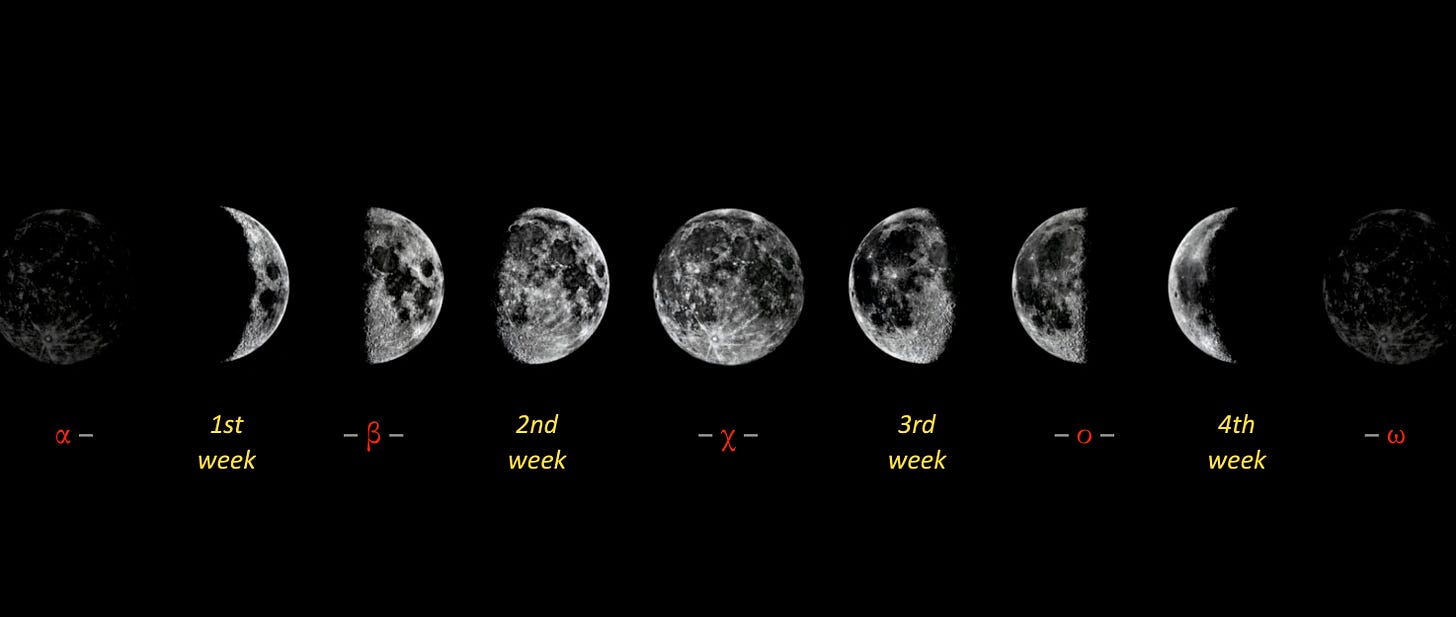 Without looking, do you know how many teeth we have? I didn’t until one day a few years ago I wondered about it and looked it up. It was a fortuitous time to do so because I had recently discovered something wondrous about the formal structure of the four books of Kingdoms. Each of the books, variously called 1–4 Kingdoms or 1–2 Samuel and 1–2 Kings, is an octave shape. I didn’t force this structural interpretation. I had gone through each book willing to see any shape or no shape at all, but each one, one by one, made the most sense as an octave. You can see the outlines on my website. As I was uploading them there, I made the realization that four octaves symbolize four weeks, which shape matches a lunar month. I realized the narrative of the four books of Kingdoms indeed follows the structure of a lunar month, with the erection of the temple symbolizing the full moon. The lunar month begins with a new moon — like having no temple, and no king to build the temple. A light appears in the form of David, but the darkness of Saul predominates. In the span of two weeks, 1–2 Samuel, the light of David waxes strong over the darkness until the moon is full and he becomes king. Then at the beginning of 1 Kings, when the moon is still full, his son Solomon builds the temple. Immediately darkness creeps in, however, as the kingdom is divided in the next generation. Across the next two weeks/books, darkness and light do battle again, this time in the form of the Northern and Southern Kingdoms. As the moon wanes, darkness prevails. By the end of 2 Kings, the temple is destroyed and the seed of David is stripped of power, the lunar cycle reverting to a new moon state.