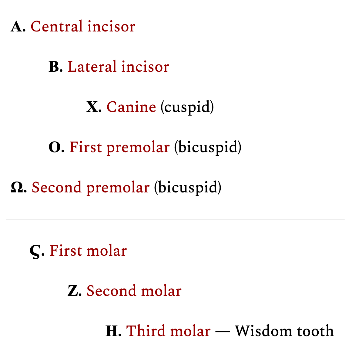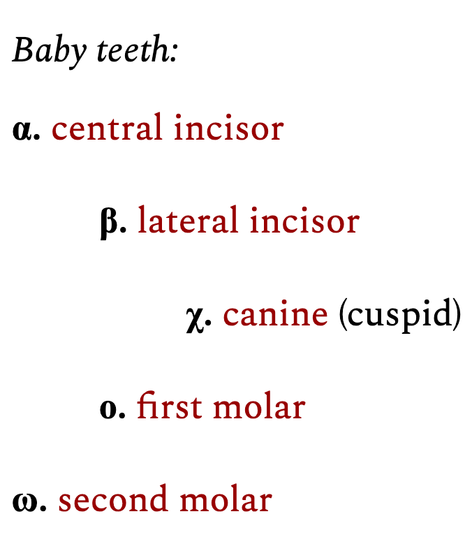 Then come the three molars, designed for grinding: the word molar comes from the Latin for millstone. They feature four or five cusps around a central fissure. They come in — “erupt” is the technical term — in three distinct stages, symbolic of the triad of purification, illumination, and perfection. The first molar (Ϛ.) erupts first, usually before any other permanent teeth, fitting in behind the baby teeth molars around age six or seven. The second molar (Ζ.) erupts generally at the end of the process of replacing the baby teeth, at around ages eleven to thirteen, at the outset of puberty. The third molar — also known as the wisdom tooth (Η.) — erupts years later than all the rest, in the late teens or early twenties, in time for the onset of adulthood, when one should be ready to get married or join a monastery. Wisdom teeth not uncommonly have trouble erupting, and modern dentistry likes to remove them beforehand just in case, even though usually they don’t present any problems even when they’re irregular. I trust my readers can read the symbolism in all that. I would not recommend parents have their children’s wisdom teeth removed unless it became strictly necessary.