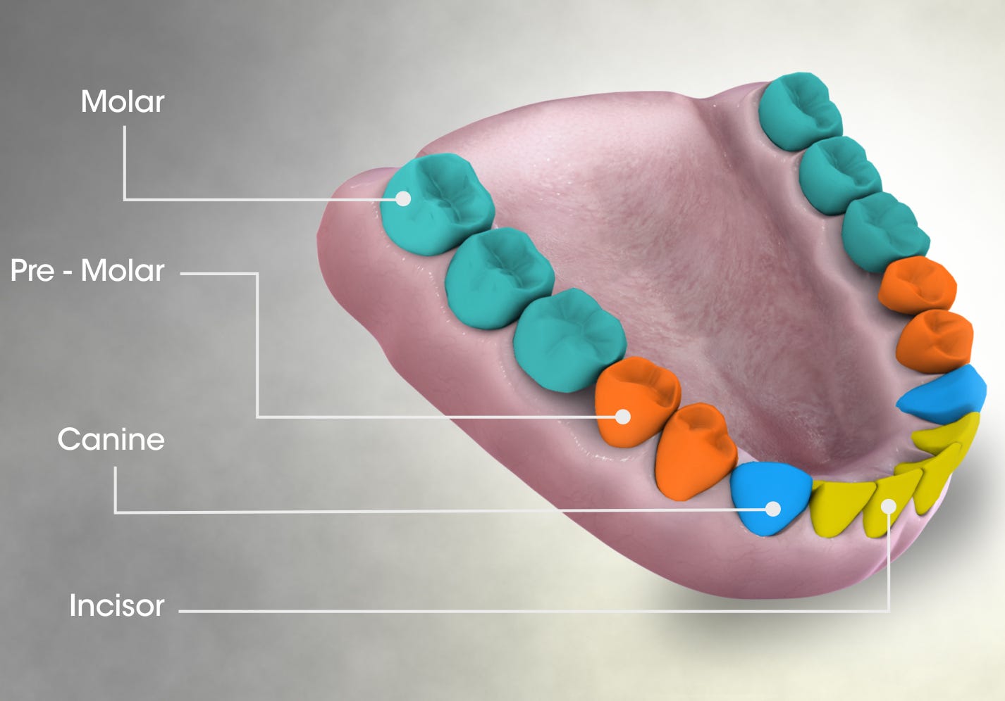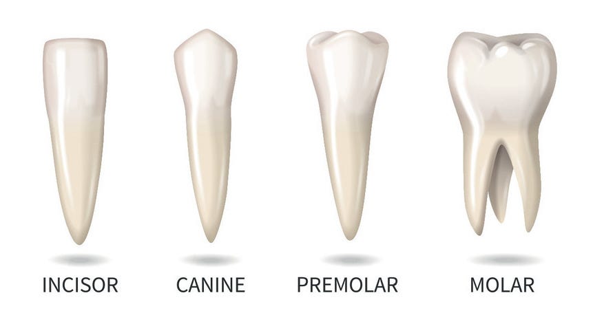 Before the thirty-two permanent adult teeth, come twenty temporary baby teeth, also called deciduous, like the trees that shed their leaves. These twenty teeth come in quadrants of five — a simple fivefold chiasmus. Two incisors and two molars hinge on a central canine. The first three are replaced with adult teeth of the same kind. The baby molars hold the places to be occupied by the adult premolars; the first adult molar grows in behind them.